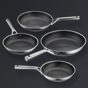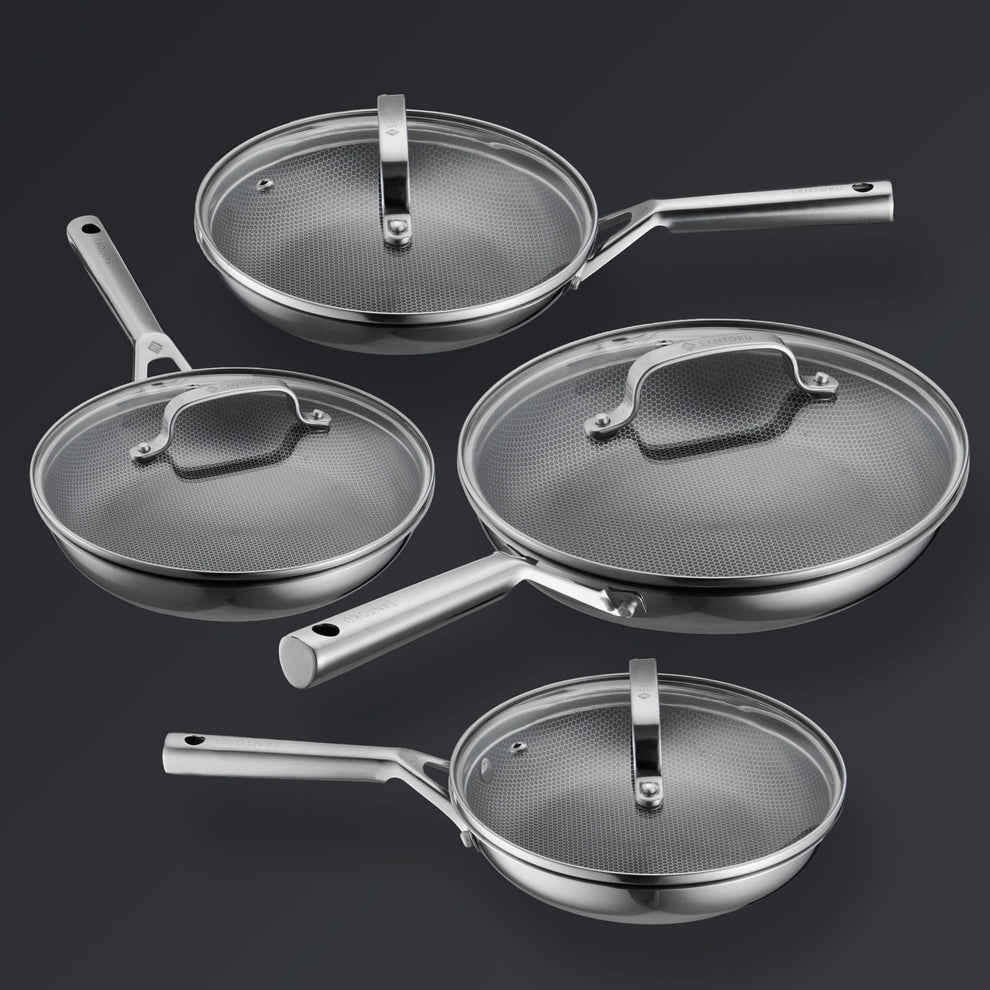 Четыре сковородки. Четыре крышки. Бесконечная производительность. Профессиональные инновационные гибридные антипригарные покрытия любого размера — 20 см, 24 см, 26 см и 28 см. Изготовлен с высокой точностью из усовершенствованной нержавеющей стали 30D с керамической поверхностью Hive Hybrid™, не содержащей химикатов. Не содержит ПТФЭ, ПФОК и ПФАС. Никаких компромиссов.